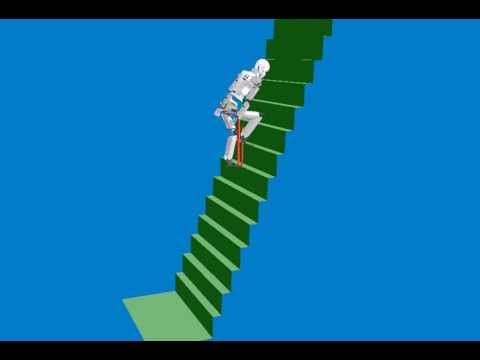 A 30 DoF simulated test robot climbing stairs with a rise of 35 cm and a tread of only 15 cm at a rate of 7.9 seconds per ten steps. Stairs this steep disallow the use of the full foot polygon to balance on a step by CoP placement, forcing us to focus on the use of angular momentum and improved weight distribution algorithms for balance control.