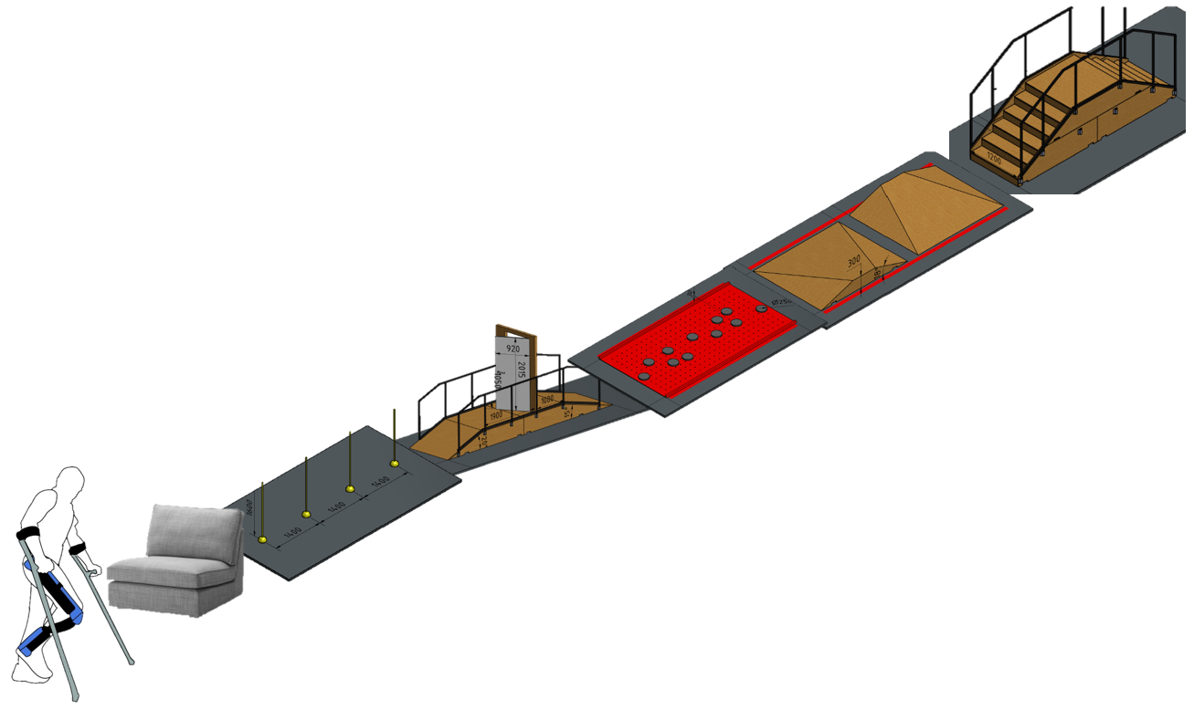 The race required that the pilot, the term used for the para-athlete wearing the exoskeleton, have a spinal cord injury with paralysis in the legs. The race started with the pilot wearing the exoskeleton seated on the sofa. There were six tasks related to daily life: getting up from a sofa, walking around obstacles, up a ramp to open and walk through a door, walk over stepping stones, walk over uneven floor, and walk up and down stairs. There were four identical obstacle courses with athletes competing head-to-head for the fastest time.