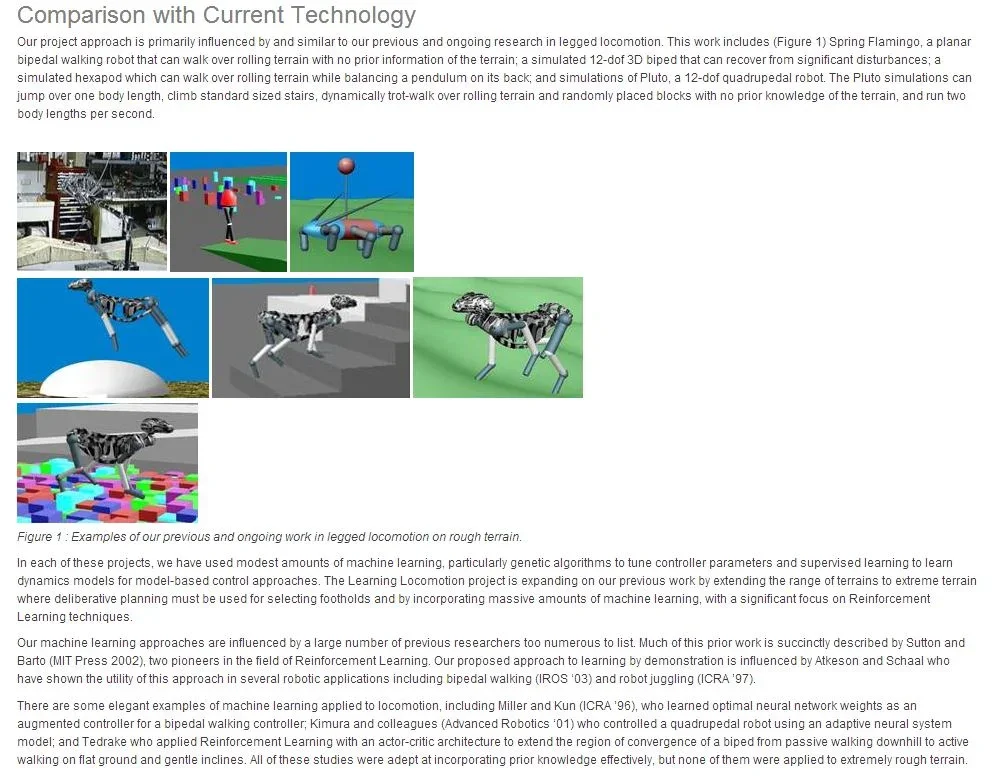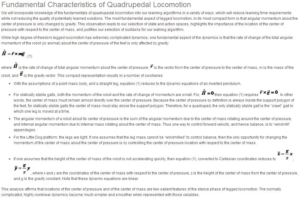 The highlights of our approach include the selection of salient state and action spaces, joint-trajectory free stance control, and effective teaching. The following description of our approach is from excerpts of our Learning Locomotion proposal written in April 2005.