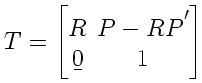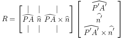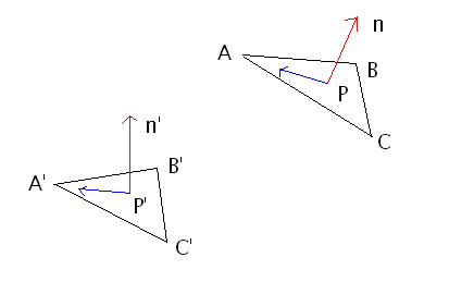 From the motion capture definition of the little dog robot, we can get a template of the 6 mocap markers in relation to the body center point at 0,0,0 position and orientation. Given any three of these points in the world (as observed during a run), we can find a transformation from the template trio (A'B'C') to the world trio (ABC). First define the centroids P and P' and the unit vectors shown below.