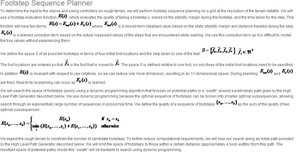 Since this is a large space, we will further divide the stance controller into subtasks of controlling body height, body orientation, and body x-y position. The height controller will use only body height as its state vector, vertical force as its action vector, and squared error between height and desired height as its penalty function to be minimized. The orientation controller will use support polygon pitch and body yaw, pitch, and roll and their derivatives as the state vector, net body torques as the action vector, and sum of the squared error between the desired orientation and the actual orientation as the penalty function to be minimized. The body x-y controller will have as the state vector the leg (x,y) positions and the body center of mass (x,y) location and velocity with respect to the center of the support polygon. It will use the center of pressure location with respect to the center of mass as the action vector. The penalty function will consist of the squared error between the desired and actual center of mass location, as well as a penalty for a low stability margin. The stability margin will be computed as the amount of sideways force that needs to be applied to the center of mass before it tips.