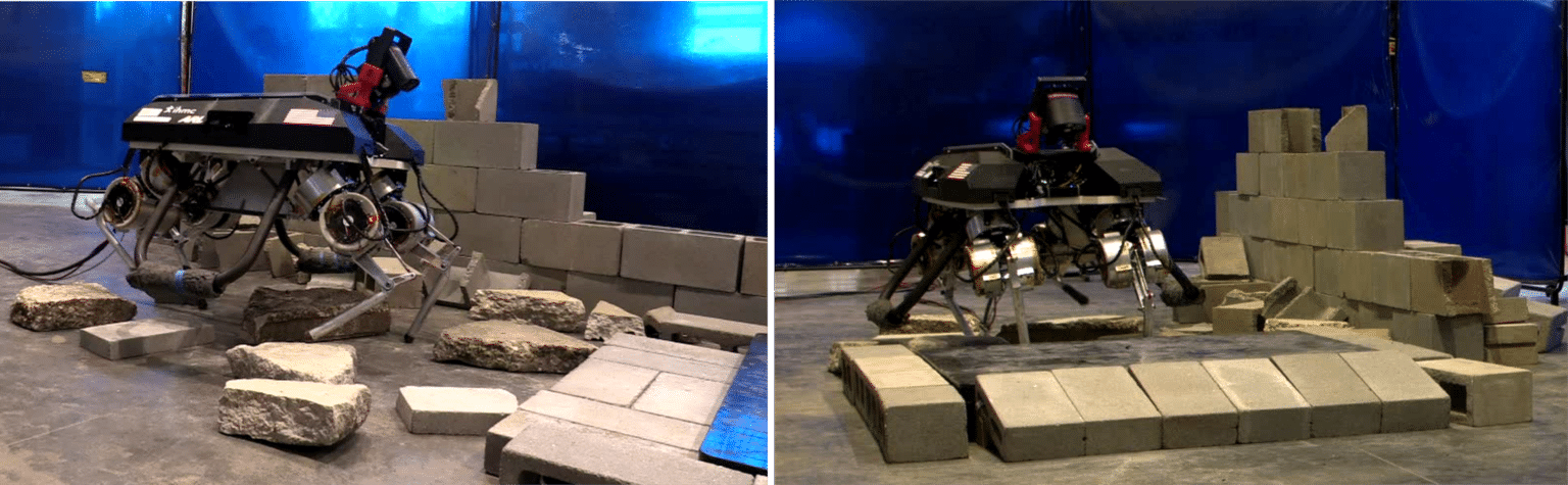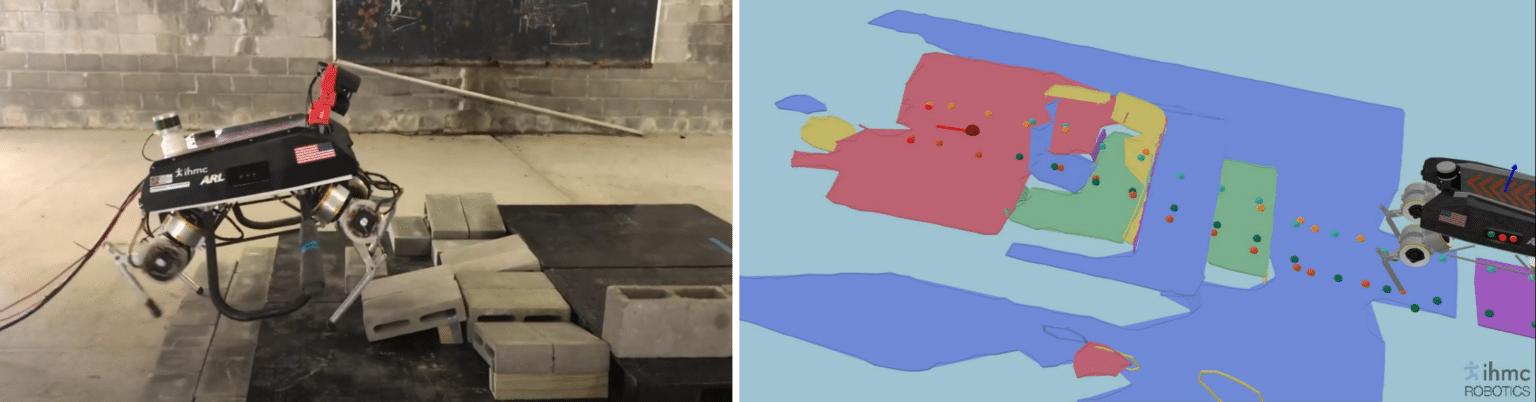 As part of the Army Research Lab’s (ARL) Robotics Collaborative Technology Alliance (RCTA), we developed novel planning and control algorithms for quadrupedal locomotion. The goal of our project was to equip the robot LLAMA, developed by NASA JPL, with the skills needed to move at operational tempo over difficult terrain to keep up with a human squad. This requires innovative perception, planning, and control techniques to make the robot both precise in execution for navigating technical obstacles and robust enough to reject disturbances and recover from unknown errors. The LLAMA robot is shown below using onboard Lidar to sense the environment and plan footholds over rough terrain.