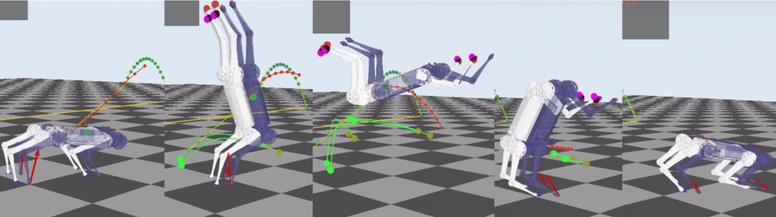 We are also researching algorithms for enabling dynamic quadrupedal motions. Through a collaboration with the MIT Biomimetic Robotics Lab we are developing these algorithms on the Mini Cheetah robot. The pictures below show the Mini Cheetah executing complex motions by performing online optimization using Model Predictive Control.